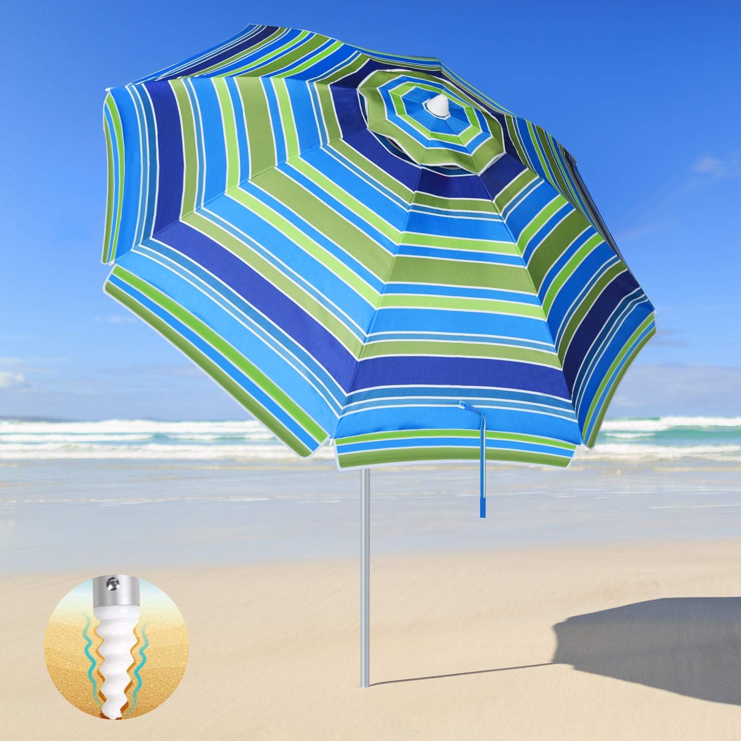 Sign up for our email newsletter. Up to 7 cash back AMMSUN 7 Foot Heavy Duty HIGH Wind Beach Umbrella with sand anchor Tilt Sun Shelter UV 50 Protection Outdoor Sunshade Umbrella with Carry Bag for Patio Garden Beach Pool Backyard Stripe Blue. This umbrella sand anchor fits any umbrella with a pole diameter of 15 inches or less.